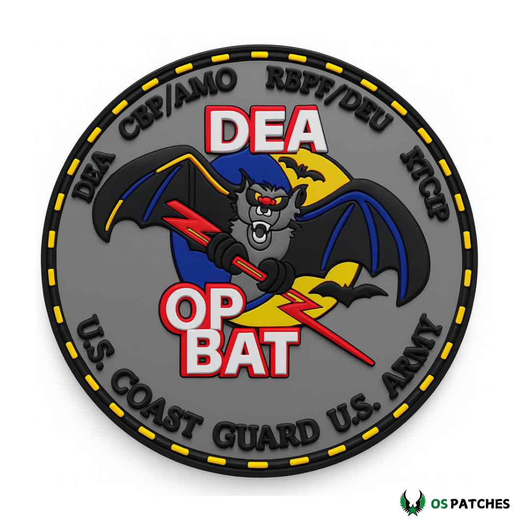 This DEA OP BAT PVC patch features a bold bat holding a lightning bolt with a moon background. Designed for tactical use, it represents DEA, U.S. Coast Guard, and U.S. Army cooperation. Made from high-quality PVC, it is durable, waterproof, and built to last in any condition. The round design with sharp details and vibrant colors makes it perfect for tactical gear, uniforms, or patch collections.