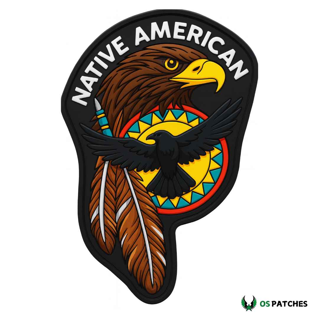 Durable Native American eagle PVC patch with tribal feather and bird design. Strong, flexible, and ideal for jackets, gear, and vests.